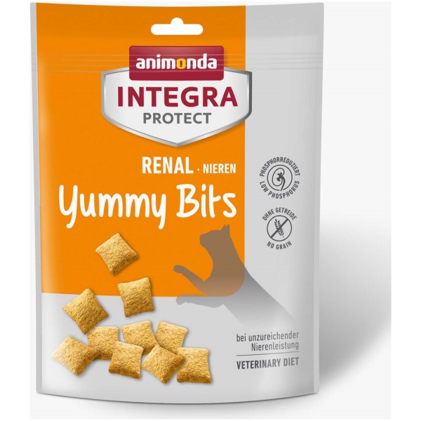 Animonda Integra Protect Cat Renal Yummy Bits er hágæða sjúkranammi fyrir ketti með skerta nýrnastarfsemi. Stökkir og bragðgóðir molar með lágt prótín- og fosfórmagn. Án soja, korns, litarefna og rotvarnarefna.