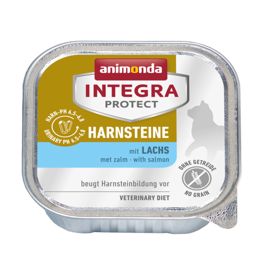 Animonda Integra Protect Cat Urinary w/Salmon er hágæða sjúkrakæfa fyrir ketti. Fóðrið er sérstaklega hannað og samsett til að fyrirbyggja nýrnasteinamyndun (strúvítsteina & oxalatsteina) í köttum. Fæðusamsetningin tryggir að sýrustíg (pH) þvags helst á bilinu 6,6-6,7 og þá myndast engir steinar. Ekkert korn er í fóðrinu þ.a. það hentar einnig köttum með kornóþol. Inniheldur lax (20%). Heilfóður eða hlutfóður fyrir fullorðna ketti. Dagsskammtur eftir aldri og þyngd skv. töflu að neðan. Án soja, litarefna og rotvarnarefna.