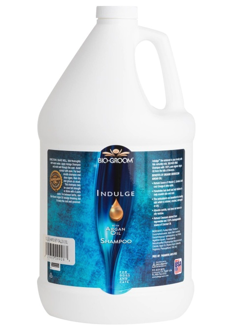 Bio-Groom Indulge Argan Oil Shampoo er milt og súlfatfrítt sjampó. Unnið úr 100% hreinni arganolíu frá Marokkó. Náttúruleg uppretta E-vítamíns, línólsýru og ómega-6 fitusýra. Gefur feldinn heilbrigðan og náttúrulegan gljáa. Græðandi fyrir húðina. Fyrir bæði hvolpa og kettlinga.