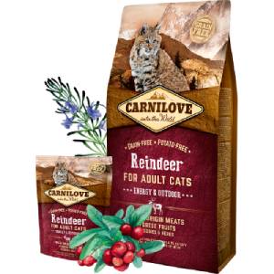 Carnilove Cat Reindeer Energy & Outdoor. Úrvalsþurrfóður fyrir orkumikla útiketti. Hreindýrakjöt tilvalið til að endurheimta orku eftir hvert kattarævintýri, enda það inniheldur mikið af náttúrulegum andoxunarefnum, ómettuðum fitum og omega-3 fitusýrum.