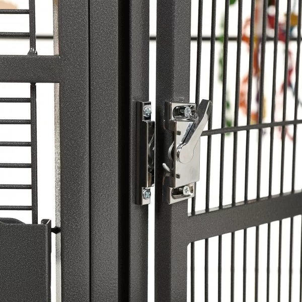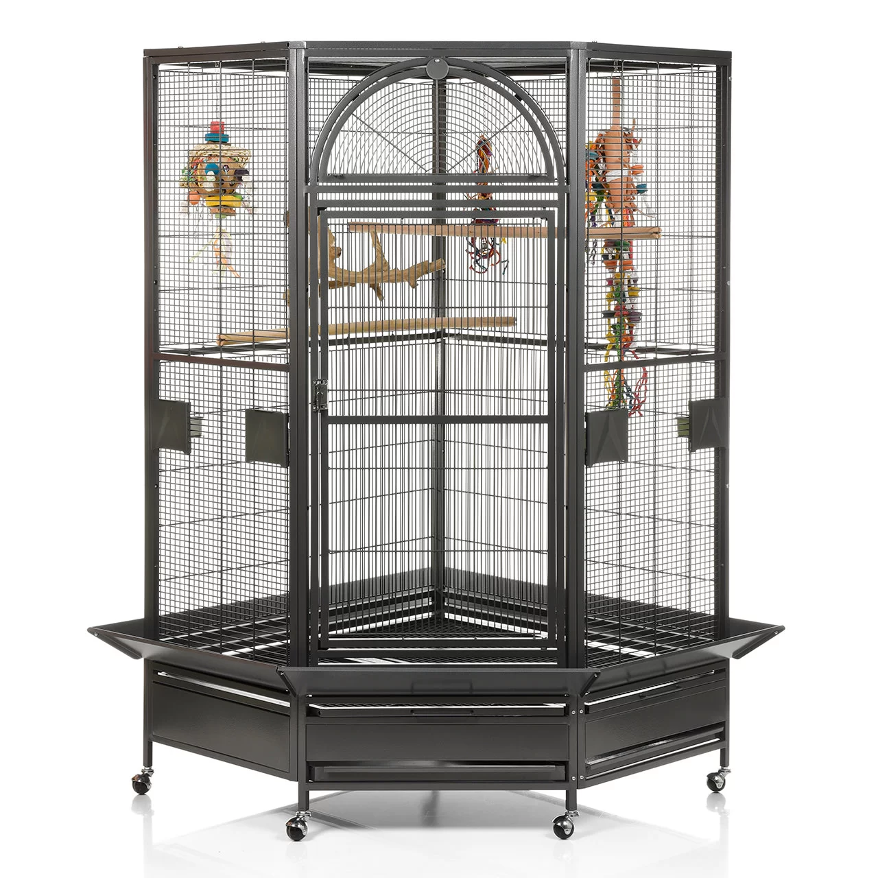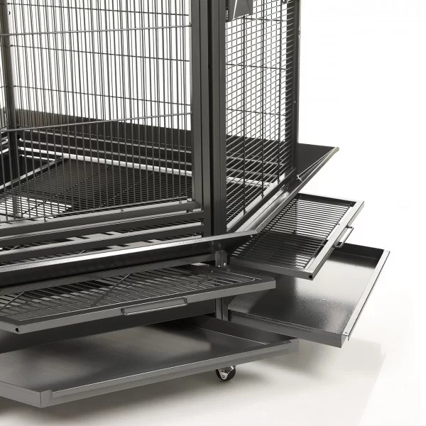 Denver II búrið frá Montana er stórt og mikið hornbúr og hentar vel fyrir alla stórfugla, kakadúa og ara. Búrið er sterklegt en samt stílhreint og fallegt. Það fer vel á hvaða heimili sem er og þolir stanslaust klifur og leiki. Á því eru hlífar til að halda rusli frá gólfinu og grind fyrir fóður og annað neðan á búrinu. Búrið er í antíkgráu (antik). Húðað með Avilon málningu sem er sérstaklega hönnuð fyrir Montana páfagaukabúrin og standana!