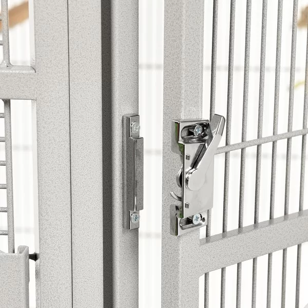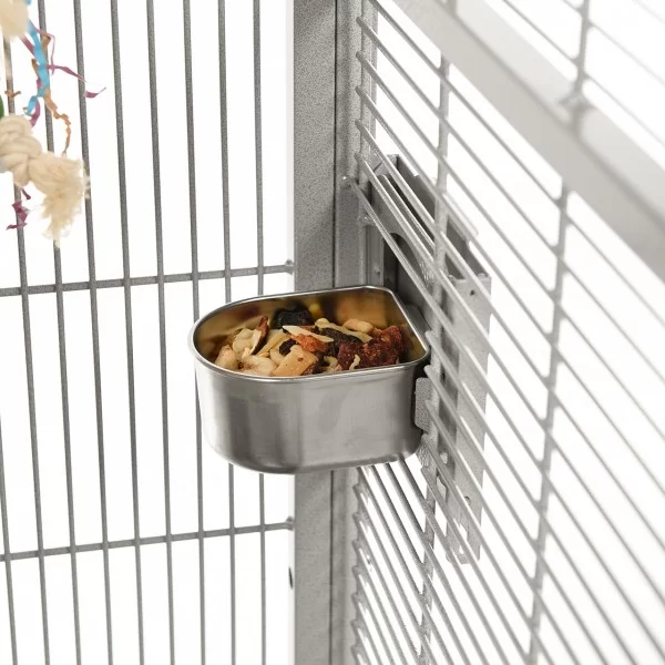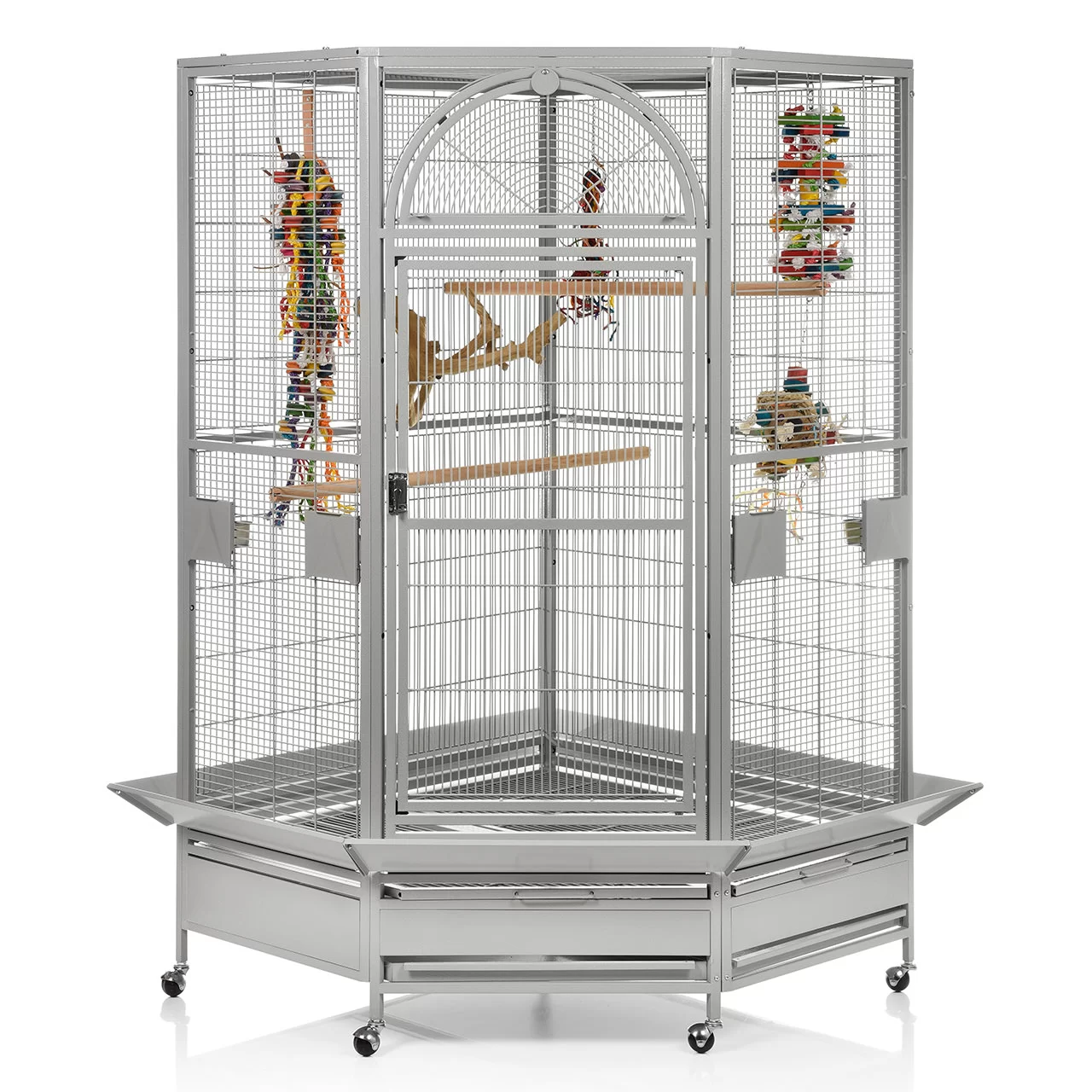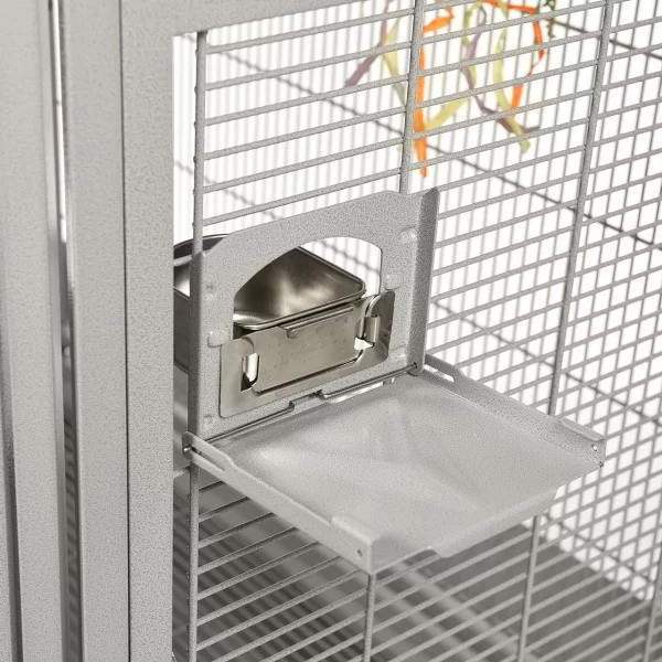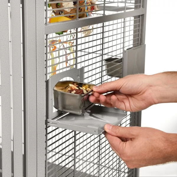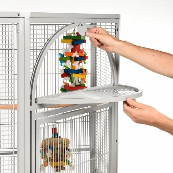Denver II búrið frá Montana er stórt og mikið hornbúr og hentar vel fyrir alla stórfugla, kakadúa og ara. Búrið er sterklegt en samt stílhreint og fallegt. Það fer vel á hvaða heimili sem er og þolir stanslaust klifur og leiki. Á því eru hlífar til að halda rusli frá gólfinu og grind fyrir fóður og annað neðan á búrinu. Búrið er í steingráu (platinum). Húðað með Avilon málningu sem er sérstaklega hönnuð fyrir Montana páfagaukabúrin og standana!