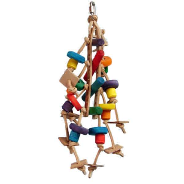 Litríkt og endingargott tætileikfang úr trékubbum og leðurreimum fyrir miðfugla. Stærð: 25 x 10 cm. Þyngd:118 g.
