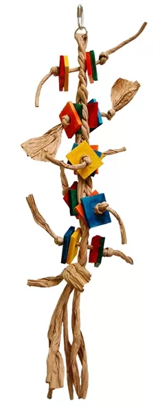 Litskrúðugt tætileikfang úr hertum pappastrimlum og lituðum viðarkubbum - fyrir stærri fugla. Stærð: 56 x 18 cm. Þyngd: 177 g.