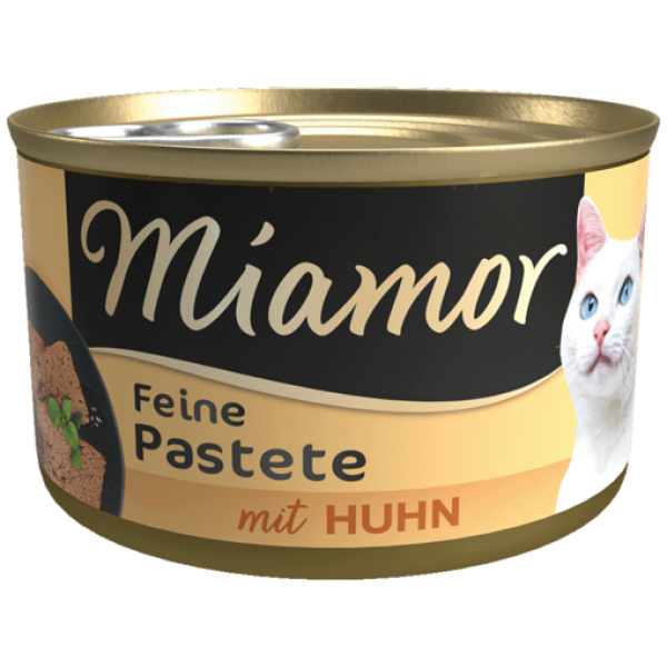 Miamor Paté of Chicken er kjúklingakæfa fyrir ketti. Algjört lostæti sem fær kattahjörtu til að slá hraðar! Án sojamjöls, litar- og rotvarnarefna. Heilfóður fyrir ketti með rétt hlutfall magnesíums og táríns til að fyrirbyggja myndun nýrnasteina.
