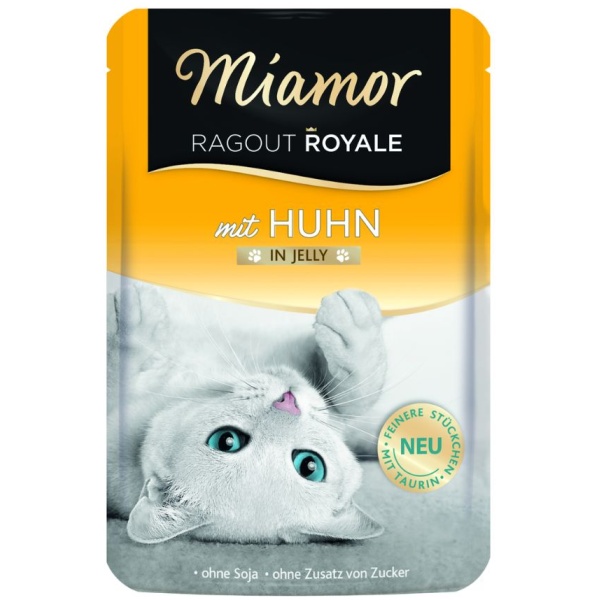 Miamor Ragout Royale Chicken in Jelly er gæða kjúklingakássa (ragúí í hlaupi. Algjört lostæti sem fær kattahjörtu til að slá hraðar! Auðmelt, án kornafurða og soja, litar- og rotvarnarefna. Heilfóður fyrir fullorðna ketti. Fyrir 4kg kött þarf 3 poka á dag.