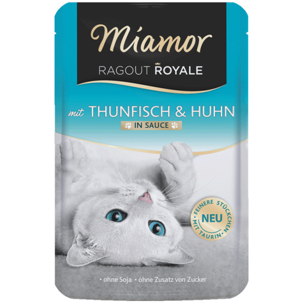 Miamor Ragout Royale Tuna & Chicken in Sause er gæða túnfisks- og kjúklingakássa (ragú) í sósu. Algjört lostæti sem fær kattahjörtu til að slá hraðar! Auðmelt, án kornafurða og soja, litar- og rotvarnarefna. Heilfóður fyrir fullorðna ketti. Fyrir 4kg kött þarf 3 poka á dag.