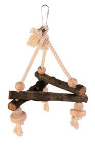 Skemmtileg þríhyrningsróla úr barkarviði og bómullarbandi. Eingöngu náttúruleg hráefni. Fyrir smærri fugla ss. gára og dísur. Stærð: 27 x 27 x27 cm.