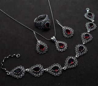 Pear Model w/Rubies - Quartet Set er skartgripasett fyrir konur - hálsmen, armband, hringur og eyrnalokkapar í stíl með perumótífi og rúbín steinum! Virkilega fallegt! Silfurkeðja fylgir!