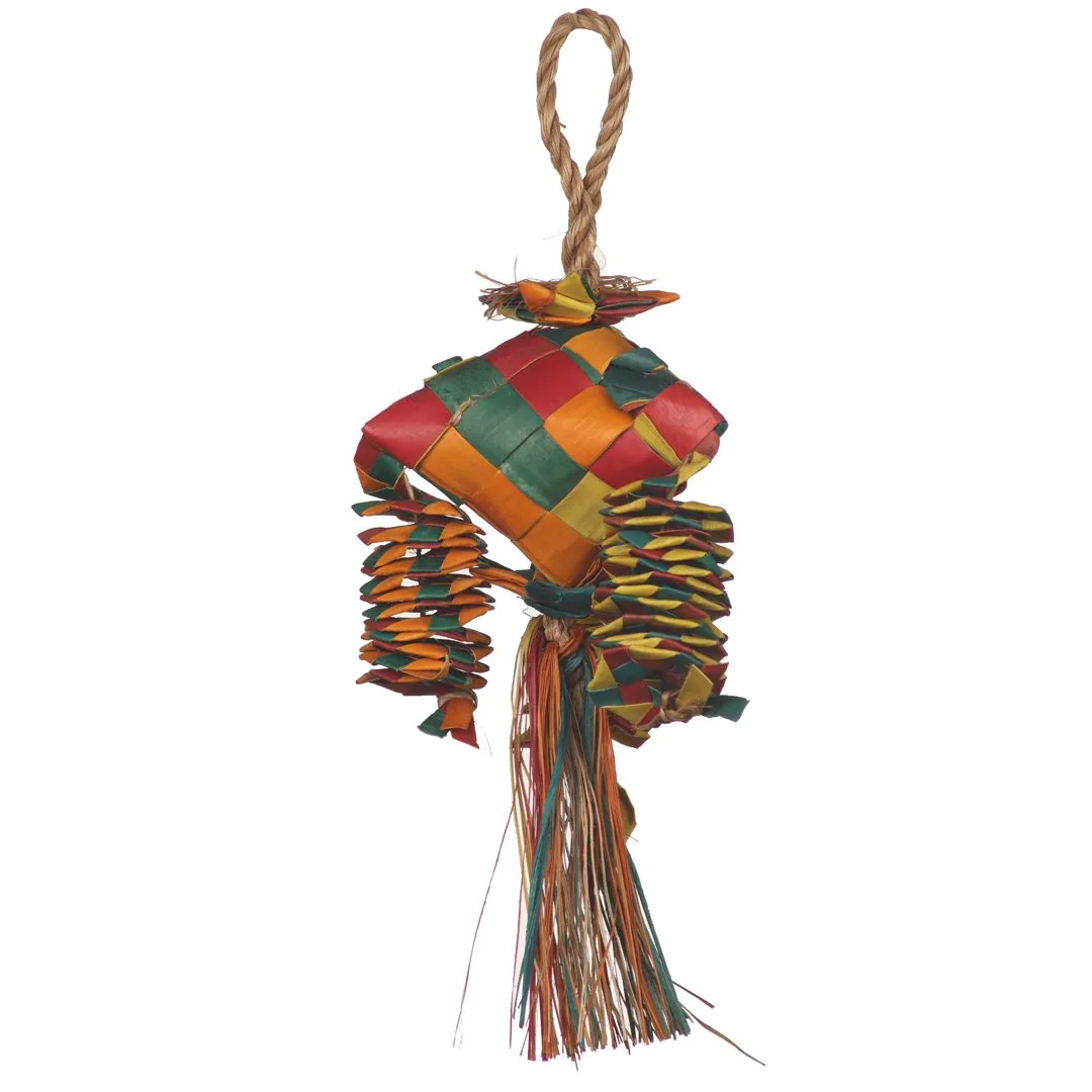 Lauflétt en skrautlegt þríhyrnt leikfang úr lituðu basti og strái. Hentar mið- og stórfuglum. Stærð: 20 x 7,5 cm. Þyngd: 45 g.