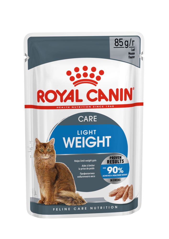 RC Light Weight Care Adult Wet Food er úrvals blautmatur og megrunarfóður fyrir offeita ketti. Fóðrið dregur úr fitusöfnun með hitaeiningalágu innihaldi sem samt skilur köttinn eftir saddann. Það er trefjaríkt til að bæta meltinguna, auðmeltanlegt og bragðgott, auk þess að efla þvagkerfið.