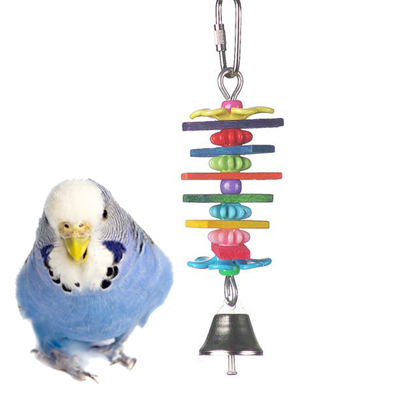Skrautleg leikfangasúla úr plastblómum og viðarbútum með bjöllu - fyrir smáfugla. Stærð: 15 x 3,7 cm. Þyngd: 18 g.
