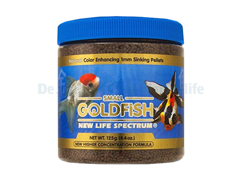 Small Goldfish Formula er fyrir alla minni gullfiska. Hægsökkvandi kögglar draga verulega úr hættunni á að skrautgullfiskar gleypi loft við fóðrun og fái meltingartruflanir eins og oft er raunin sé þeim gefið flögufóður. Þótt gullfiskar og koiar séu grænmetis- og þörungaætur þá éta þeir einnig mikið af vatnalífverum til að fá nauðsynleg prótein. Búrlíf tryggir yfirleitt ekki nægt framboð af þörungum til að mæta þessari þörf en samsetning New Life Spectrum Goldfish Formula gerir það hins vegar og svo um munar!