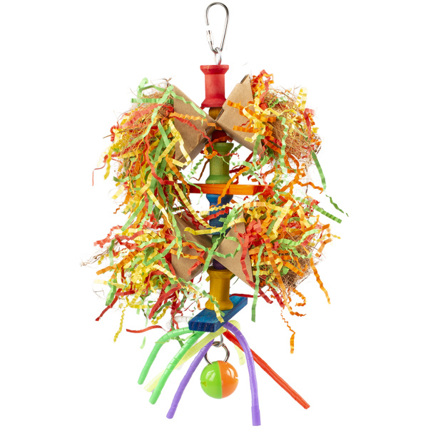 Marglitt tætileikfang úr viðar- og pappírsstrimlum á reipi fyrir miðfugla. Stærð: 33 x 17 x 4,5 cm.